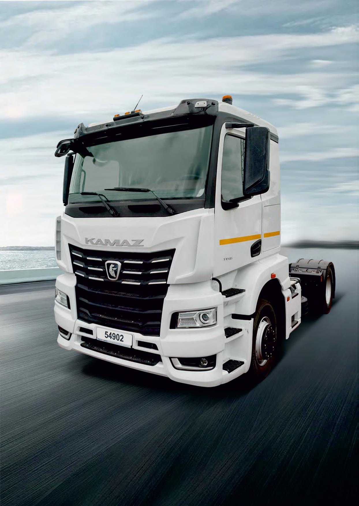 Седельный тягач КАМАЗ-54902 (4х2) – модель, разработанная для региональных перевозок на сравнительно небольшие расстояния и выведенная на рынок в 2024 году. КАМАЗ-54902 относится к новейшему поколению К5 и отличается современной комфортабельной кабиной шириной 2,3 м с низкой крышей и одним спальным местом. Автомобиль построен на новой санкционно устойчивой компонентной базе. Тягач оснащён проверенным временем двигателем KAMAЗ-689 мощностью 390 лошадиных сил и 12-ступенчатой роботизированной коробкой передач с тормозом-замедлителем (ретардером), который позволяет более безопасно преодолевать затяжные спуски и снизить износ основных тормозных механизмов. Также установлен экономичный гипоидный ведущий мост с оптимально подобранным передаточным отношением.
